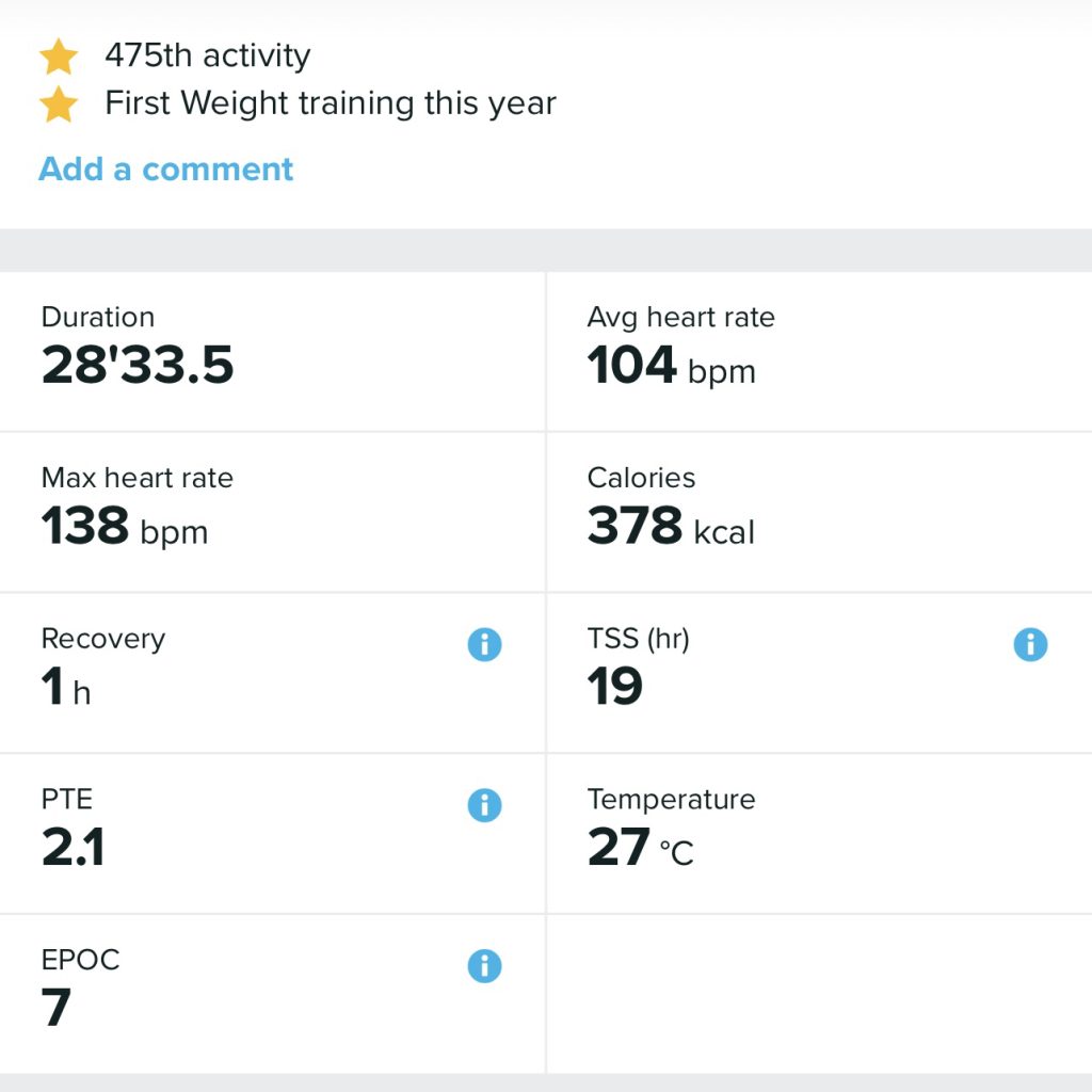 I was able to walk on the treadmill for 10 minutes, then almost 30 minutes of light strength exercises finishing with another 10 minutes on the stationary bike. I have managed to sweat and that’s what it’s all about isn’t it?