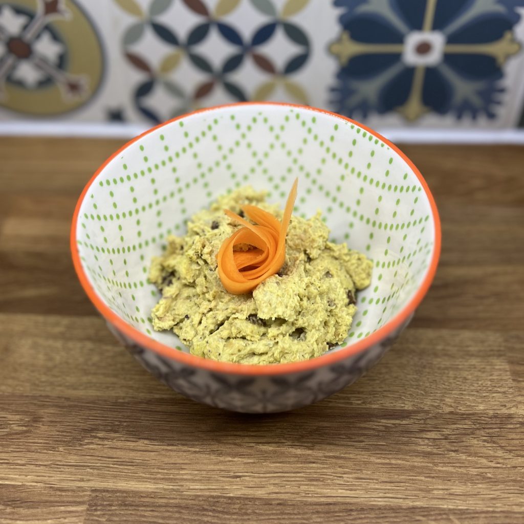Drain your chickpeas. Add all ingredients apart from red onion and raisins into a bowl and blend it up. Soak raisins in a cold water for 5 minutes then drain and add along with the finely chopped red onion. Mix all together. Done.